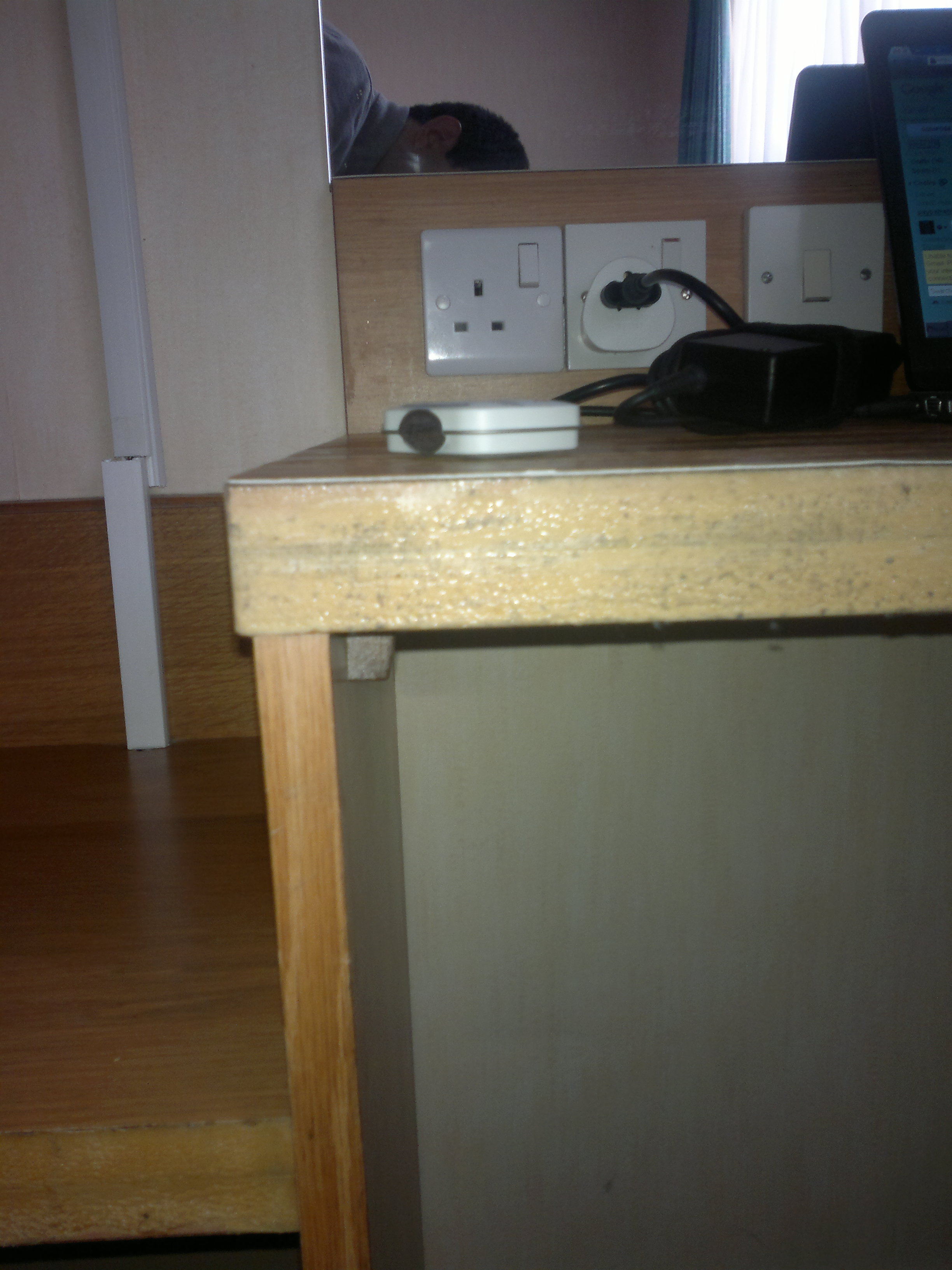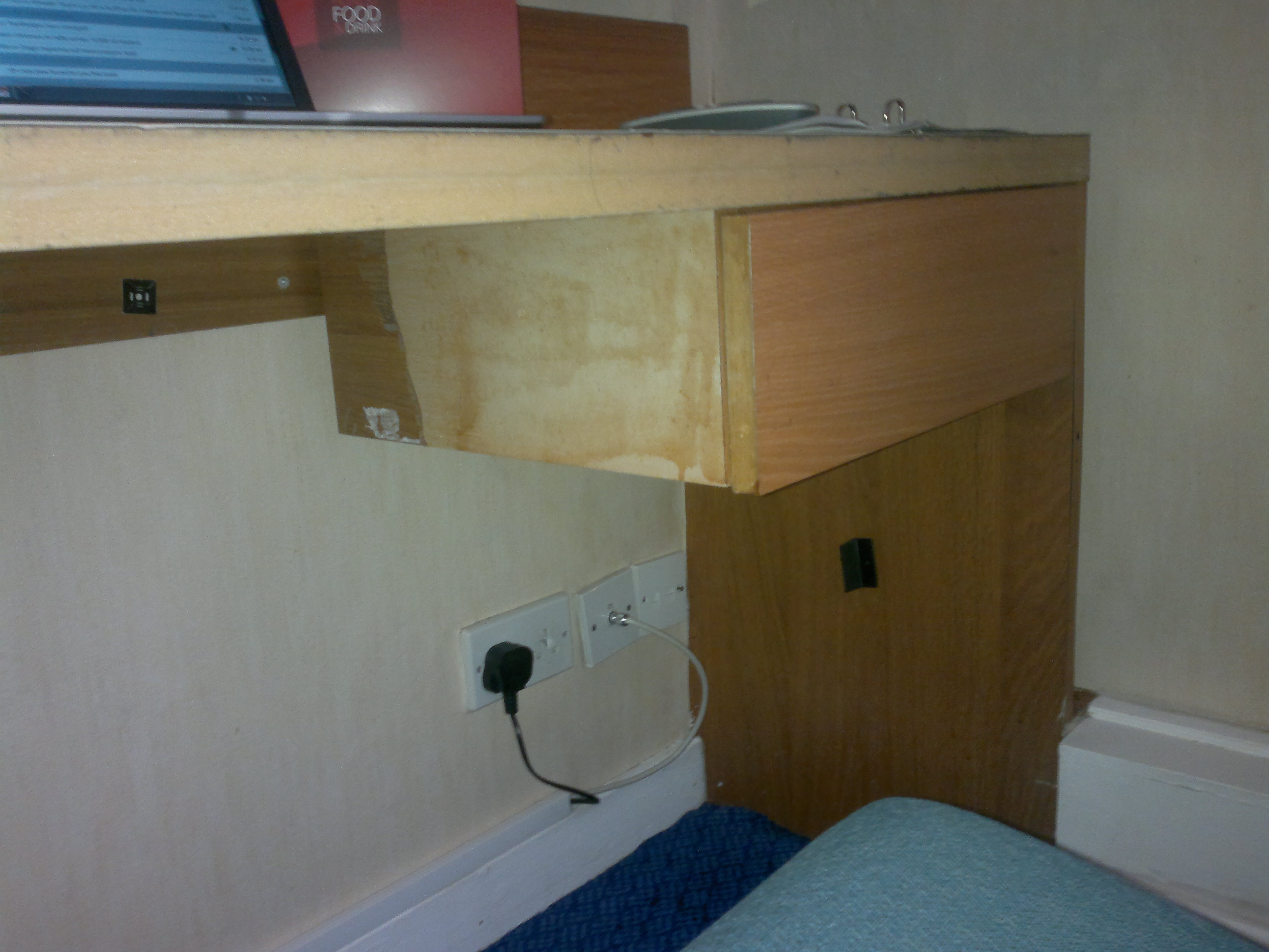 Tapestry on the wall was bulging, the desk finish was of low quality wood-like hard plastic and some large patches were missing altogether.